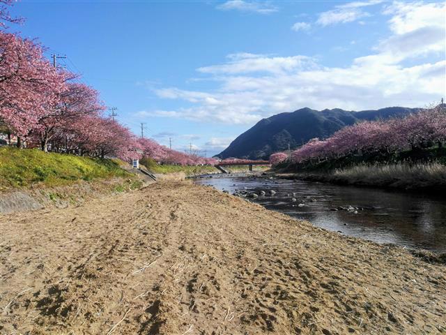 Pour les fans de cerisiers ou ceux qui prévoient leur prochain voyage en hiver, je recommande Kawazu. Située dans le sud de la péninsule, la région est réputée pour ses cerisiers précoces qui fleurissent généralement début février, environ deux mois avant le pic à Tokyo et ses alentours. Une occasion rare de pouvoir admirer ce paysage symbolique en dehors de la haute saison. Lors de notre passage, nous nous sommes installés dans un hôtel près de la côte à Higashi-Izu, à 30 min en train, et avons terminé notre agréable journée en profitant de la vue panoramique sur la baie.