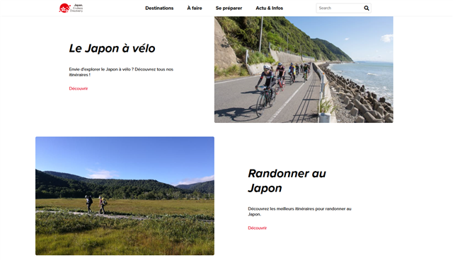 Quoi de mieux, en voyage, que de prendre son temps ? Et quoi de mieux pour cela que de marcher ou pédaler ? Certes, tout le monde ne peut ni ne veut traverser le Japon à pied ou à vélo – et ce n’est pas là notre propos ! Mais, afin de répondre à un besoin de voyages et d’activités différentes, au plus près de la nature tout en étant respectueux de celle-ci, le JNTO a mis en ligne, dans sa rubrique « aventure », de nouveaux articles autour de la randonnée et du cyclotourisme.